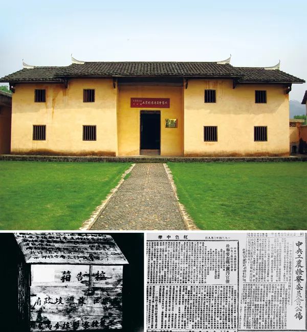 在中央苏区、延安时期,我们党探索了一套对苏维埃政府、边区政府和革命根据地人民政权组织及其工作人员的监督办法。 上图为江西瑞金中华苏维埃共和国工农检察委员会旧址;下左图为当年江西兴国县高兴区苏维埃政府工农检察部设置的控告箱;下右图为《红色中华》报关于中央印刷厂等单位贪污案查处结果和检举于都县苏维埃工作人员营私贪污案的报道。 中共江西省赣州市委党史办供图